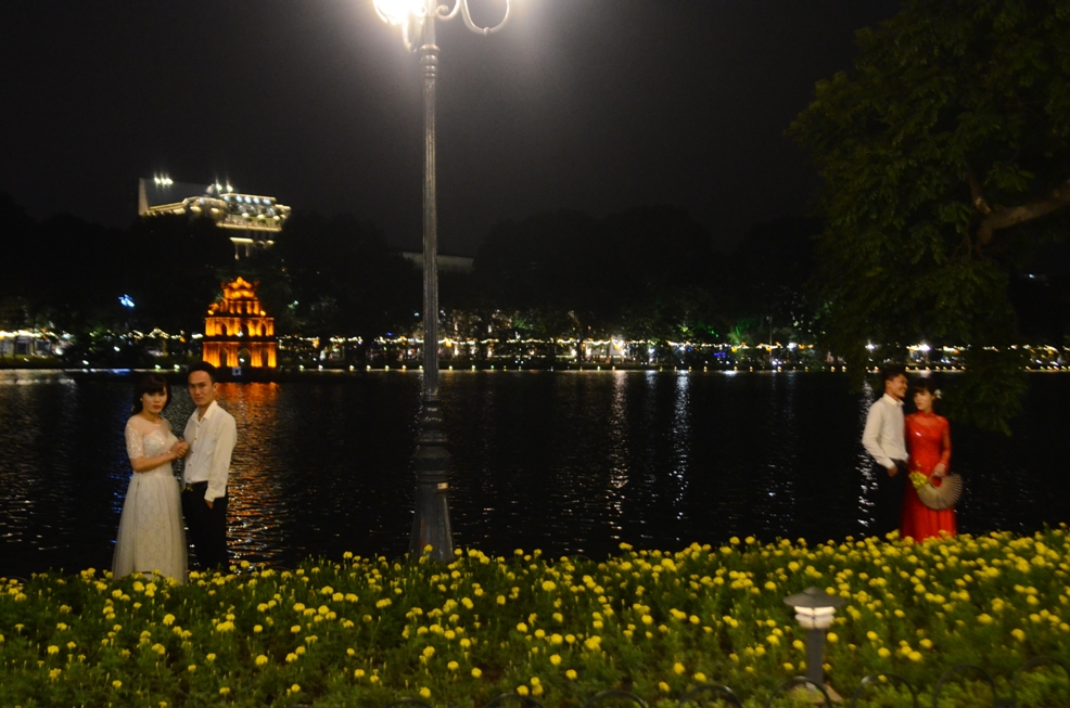 特别是,还剑湖边还是新人们拍婚纱照,留下爱情最美瞬间的地方。一个新郎在拍完婚纱照后兴奋地说:“这几天比较冷,但我们还是选在还剑湖拍婚纱照,因为,我认为,这里对越南人来说是个神圣的地方。第二个原因是这里的夜景十分浪漫,可以拍出好的照片。”