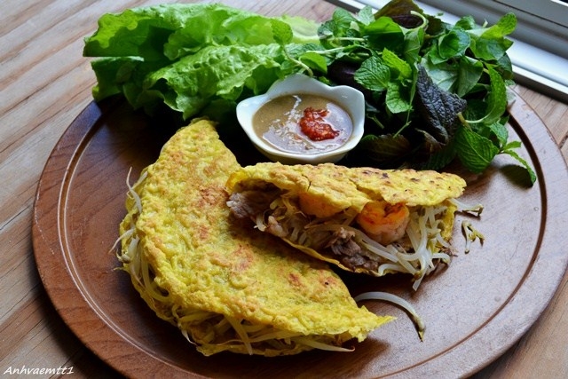 三、煎饼(Bánh xèo):“煎饼”越南语为“感觉烫手”的意思。煎饼很大,但价格却很便宜。做煎饼的主要原料包括虾仁、猪肉、豆芽和鸡蛋。这些原料炸好后用薄饼寡好,配着青菜及蘸着辣鱼露吃。