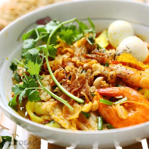 八、广式面(Mì Quảng):广式面的原料异地不同。最基本的广式面组成原料一般包括青菜、虾仁、鹌鹑蛋及落花生等。