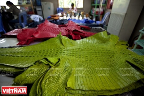 外国游客了解茄花鳄鱼皮货公司的产品(图:越通社)