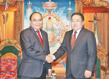 阮春福总理(左)与蒙古总统查希亚·额勒贝格道尔吉(图:人民报网)