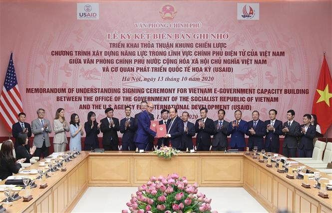 越南政府办公厅代表同美国国际开发署(USAID)代表10月13日下午签署了有关开展关于越南电子政务服务能力建设计划的框架协议的备忘录。
