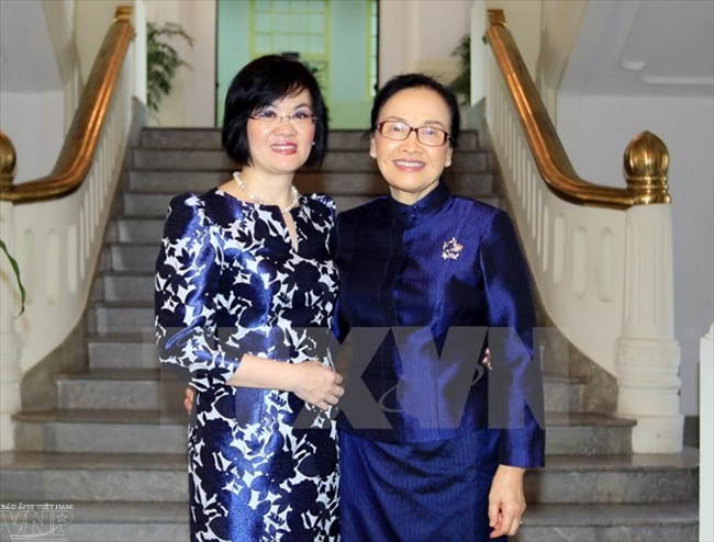 越南妇联执委会委员、河内市东盟共同体妇女小组名誉主席阮月娥(左)和老挝外交部妇女协会名誉主席娜丽·西苏里(图:越通社)