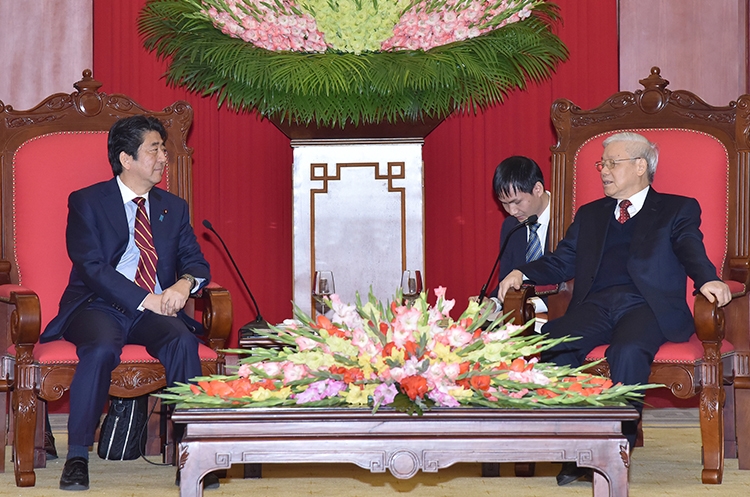 在党中央总部会见日本首相安倍晋三会见时,阮富仲总书记在会见中对其在越日广泛战略伙伴关系正良好发展的背景下重访越南表示热烈欢迎。阮富仲总书记对近年来越日关系在两国高级领导人所达成协议,特别是在《越日共同愿景声明》基础上的各领域务实且强劲进展表示满意。