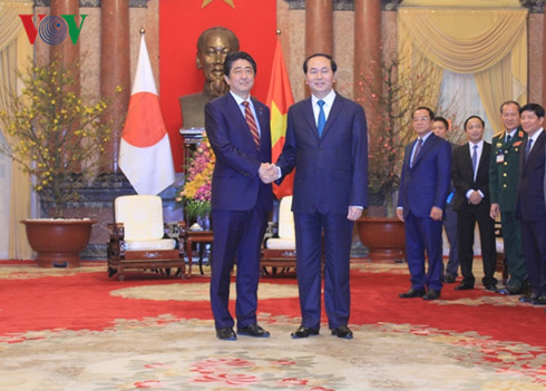 在国家主席府会见日本首相安倍晋三时,陈大光主席欣慰地看到政治互信不断加深的越日广泛战略伙伴关系日益蓬勃、全面和务实发展。陈大光主席重申, 越南十分重视与日本的全面合作关系,将之视为越南外交政策的头等优先之一。