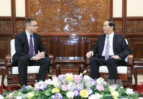 越南国家主席陈大光与芬兰驻越大使埃尔卡·帕克·西米拉(左)谈话(图:越通社)