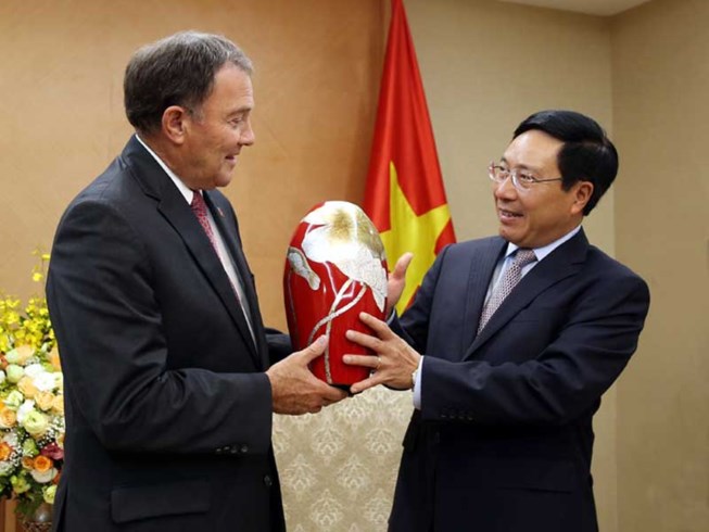 会见中,政府副总理兼外交部长范平明高度评价犹他州州长的此次访越,并欢迎犹他州乃至美国其他各州同越南各地方进一步加强合作,有助于推进两国全面伙伴关系。