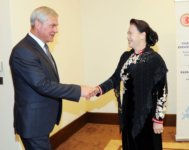 当地时间10月9日中午,越南国会主席阮氏金银分别会见韩国国会议长文喜相(Moon Hee Sang )和 白俄罗斯众议院议长弗拉基米尔.安德烈琴科(Vladimir Andreichenko)。
