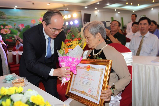 胡志明市市委书记阮善仁向阮氏西授予“越南英雄母亲”称号(图:越通社)